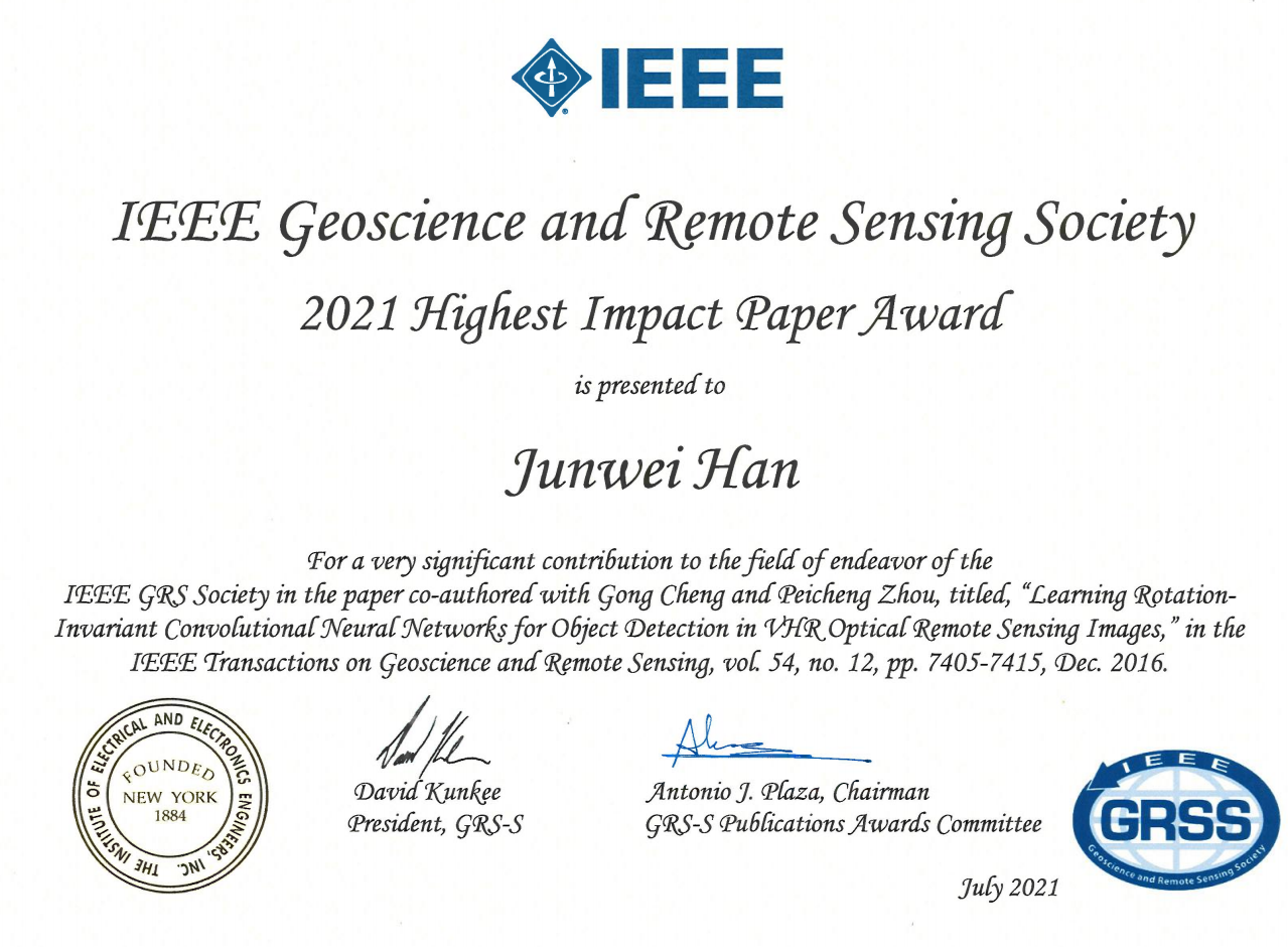 脑与人工智能研究团队韩军伟、程塨教授等合著的论文“Learning rotation-invariant convolutional neural networks for object detection in VHR optical remote sensing images”获得2021年度IEEE地球科学与遥感学会最有影响力论文奖(IEEE GRSS Highest Impact Paper Award)。该奖项由IEEE GRSS(IEEE地球科学与遥感学会)设立,是遥感领域最有影响的论文奖项之一,每年颁发1次,从约8000篇论文中评选而出,旨在奖励过去5年发表在IEEE GRSS主办的3个SCI期刊上(IEEE TGRS、IEEE JSTARS、IEEE GRSL)引用次数最多、影响力最大的学术论文(received the highest number of citations and impact over the past 5 years)。肉漫屋