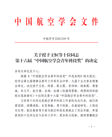 2021年11月3日,中国航空学会正式公布《关于授予王恒等十位同志第十六届“中国航空学会青年科技奖”的决定》文件, 肉漫屋