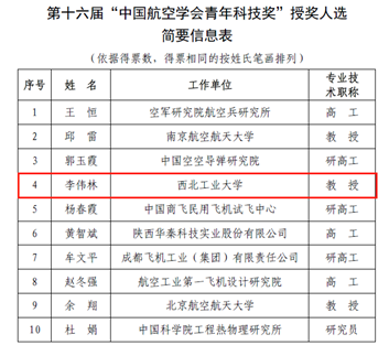 李伟林教授名列其中,荣获“中国航空学会青年科技奖”。中国航空学会将于11月底在乌镇召开的中国航空科学技术大会上举行颁奖仪式。