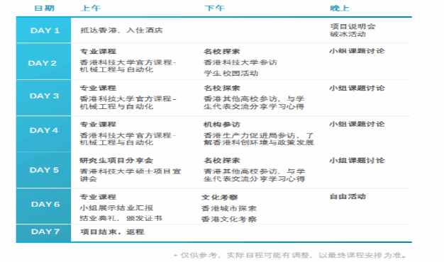 费用包含:大学学费、机构参访费用、四星酒店双床间住宿费用、在港期间的大巴交通、保险费等;
