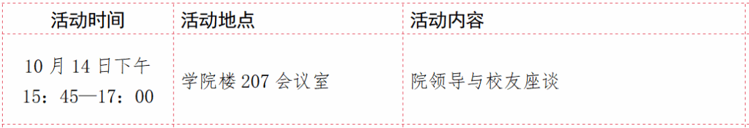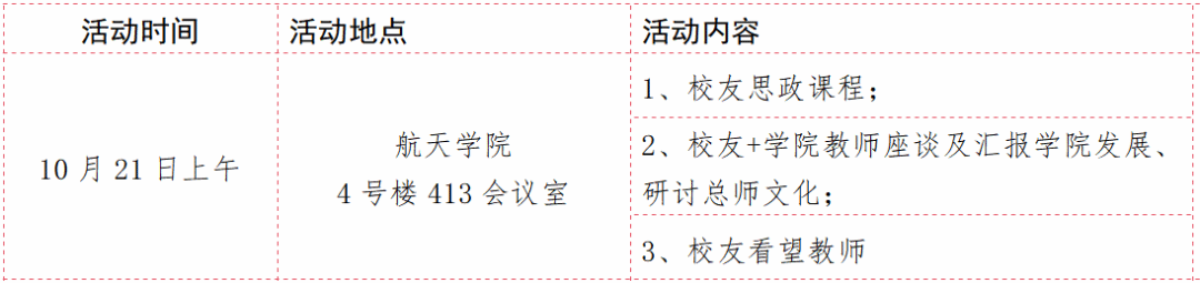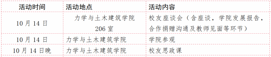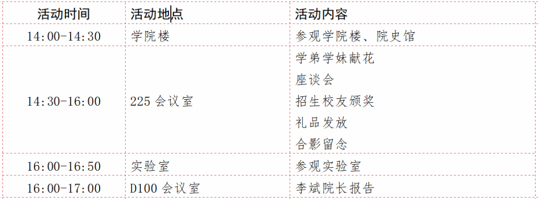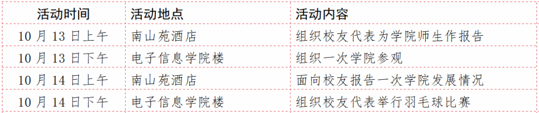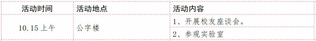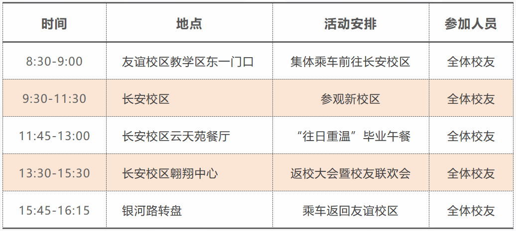 注:上述表格中的8:30-9:00、15:45-16:45两个时段分别为集中乘车出发和返程的时间,请校友们务必按时乘车。