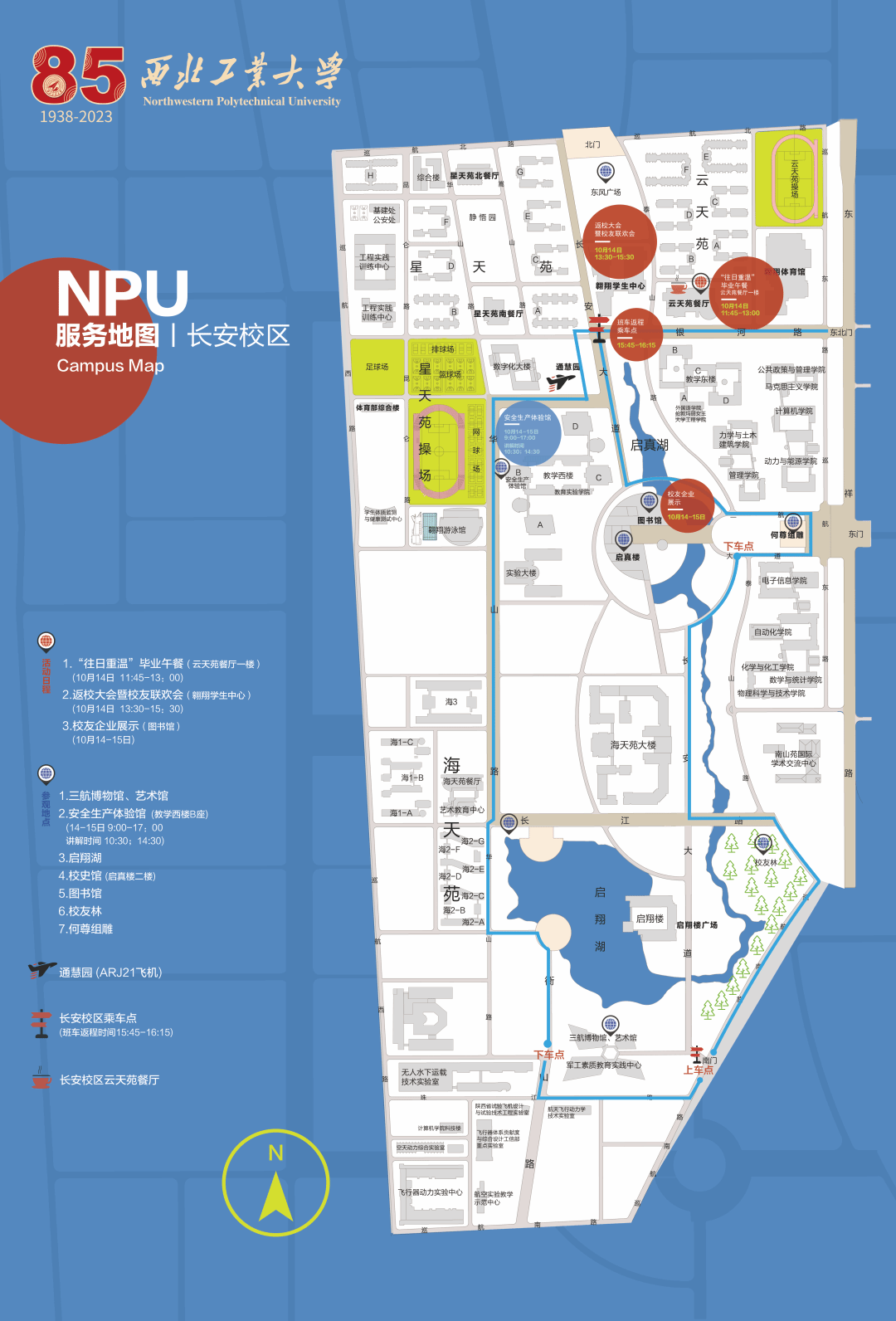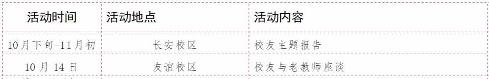 温馨提示:校友会为校友们精心制作了友谊校区和长安校区活动地图,图中标注有活动日程、乘车点,及相关场馆参观讲解等信息,请校友们点击图片查看。