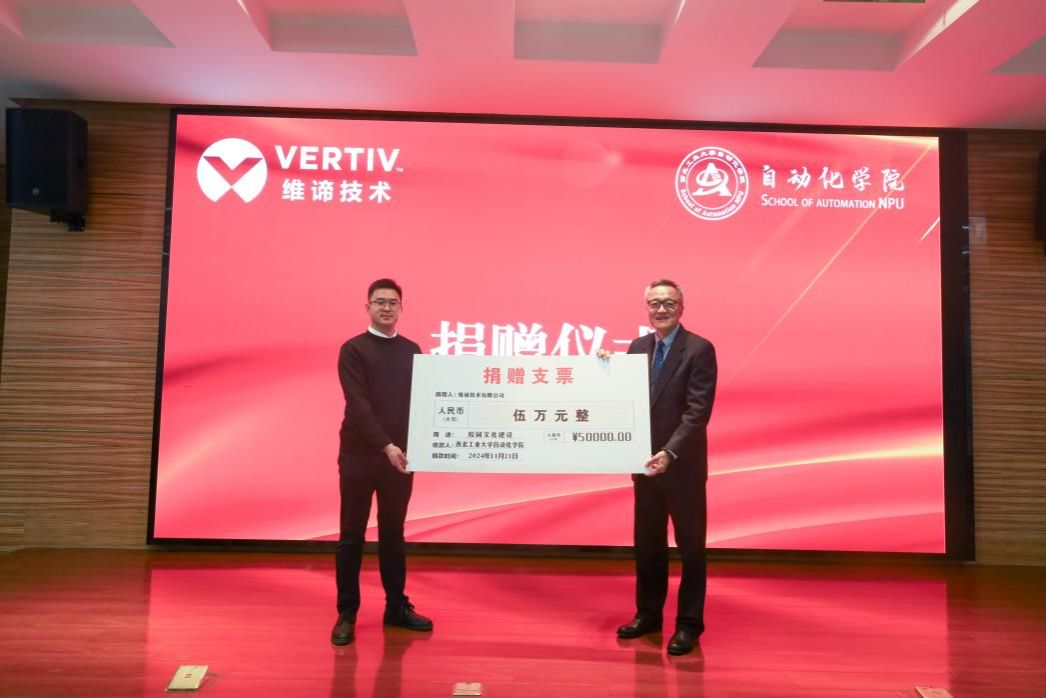 校园文体活动的开展。捐赠仪式上,张林向易正阳交接了捐赠支票。苟兴旺代表学校向张林颁发了捐赠证书并致辞。苟兴旺向维谛技术对学校事业发展的大力支持表示感谢,特别是校企通过文体活动的桥梁进一步密切了合作,希望后续能在学生实习就业、科研合作等方面为企业提供更多支持。