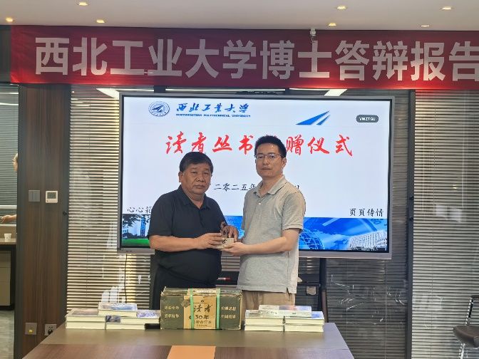 院长、党委书记李伟林教授代表全院师生,满怀敬意地接受了这份沉甸甸的馈赠。李伟林在致辞中高度评价了晁博士的慷慨之举,他动情地说道:“这不仅是一套套书籍,更承载着晁世元校友对知识传承的尊重、对西工大“总师型”育人文化的践行以及对后辈学子的殷切期许。”为表达学院的诚挚谢意与崇高敬意,李伟林代表学院向晁世元博士回赠了肉漫屋
