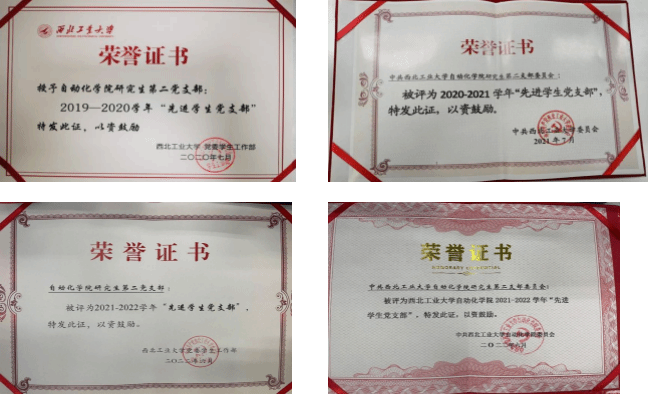 在指导教师、支部委员会以及支部成员的共同努力下,研究生第二党支部连续四年获校级“先进学生党支部”(2020-2023年),2020年、2021年、2022年连续三年获 “三创三力”样板学生党支部(全校仅10个学生支部获评),2022年度肉漫屋