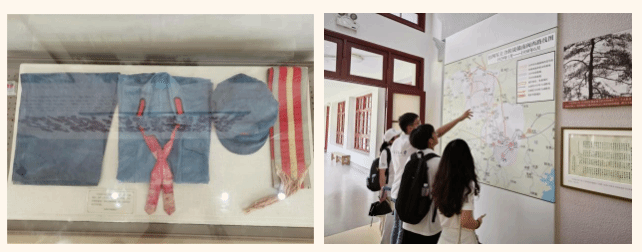 在古田会议纪念馆内,大家见到了一件珍贵的展物——一套缀有红领章的灰蓝色军装、一顶缀有红五星的八角形军帽和一副绑腿布,这是红四军自创建以后第一套正式的统一军装。质朴的军服见证了红军逐步走向正规和成熟的进程,也反映了红四军创建中央革命根据地的艰苦历程。当同学们仔细观察这套军装时,仿佛能听到当年红军战士们无惧困难、坚定不移的脚步声,感受到他们在战火中无畏艰险、冲锋陷阵的革命豪情。这套军装,既是红军战士们浴血奋斗的战衣,也是红军战士们为国牺牲的物证。