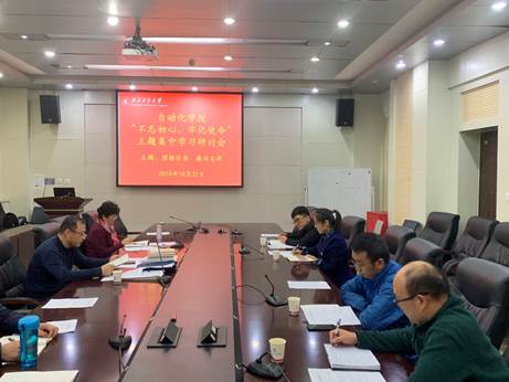 于2019年10月22日下午2:00召开以“理想信念、廉洁自律”为主题的“不忘初心、牢记使命”主题教育第三次集中学习研讨及对照党章党规找差距专题会议。院党委书记潘泉,副院长吴小华,党委委员王长青及各系党支部书记参加此次大会。会议由潘泉书记主持。