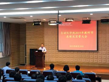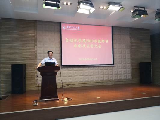在院学术报告厅举行了2019年教师节表彰及宣誓大会。学院党委书记潘泉、院长黄攀峰、副院长吴小华、李爱军,副书记邱若娟、李伟林及全体教职工参加了大会。会议由李伟林副书记主持。