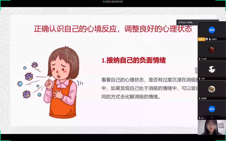 2017级通过线上视频会议、观看心理教育视频、QQ群讨论等多种方式,积极开展心理主题班会。小班心理委员讲解了疫情期间居家不出门面临的常见心理困惑。同学们分享和讨论了自己的心理状态及应对疫情的方法,面对当前有困惑的同学,大家积极出谋划策,为其排忧解难。会后,同学们纷纷表示,此次班会为大家提供了一个很好的沟通交流的平台,了解了心理健康知识,有效缓解了疫情期间居家无法出门导致的焦虑情绪。