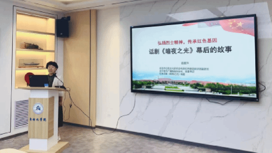 思政课上,与会人员共同观看了红色话剧《暗夜之光》,观剧结束后,苗爱萍围绕话剧创作的背景和感受展开了细致讲解,在深度解析刘谦初烈士革命英雄事迹的基础上,结合创作过程中迎难而上的种种故事,为与会人员呈现了一场震撼而又极具教育意义的思政课。