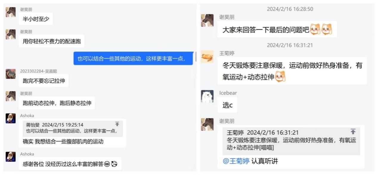 田径队团支部的团支书蒋怡斐负责活动策划;副书记时康哲和组织委员吴嘉懿结合支部同学们的建议制作了内容详实、画面精美的PPT;谢昊朋给同学们带来生动细致的宣讲并和同学们进行互动,同时将宣讲录屏发布在交流答疑群中供同学们回看学习。