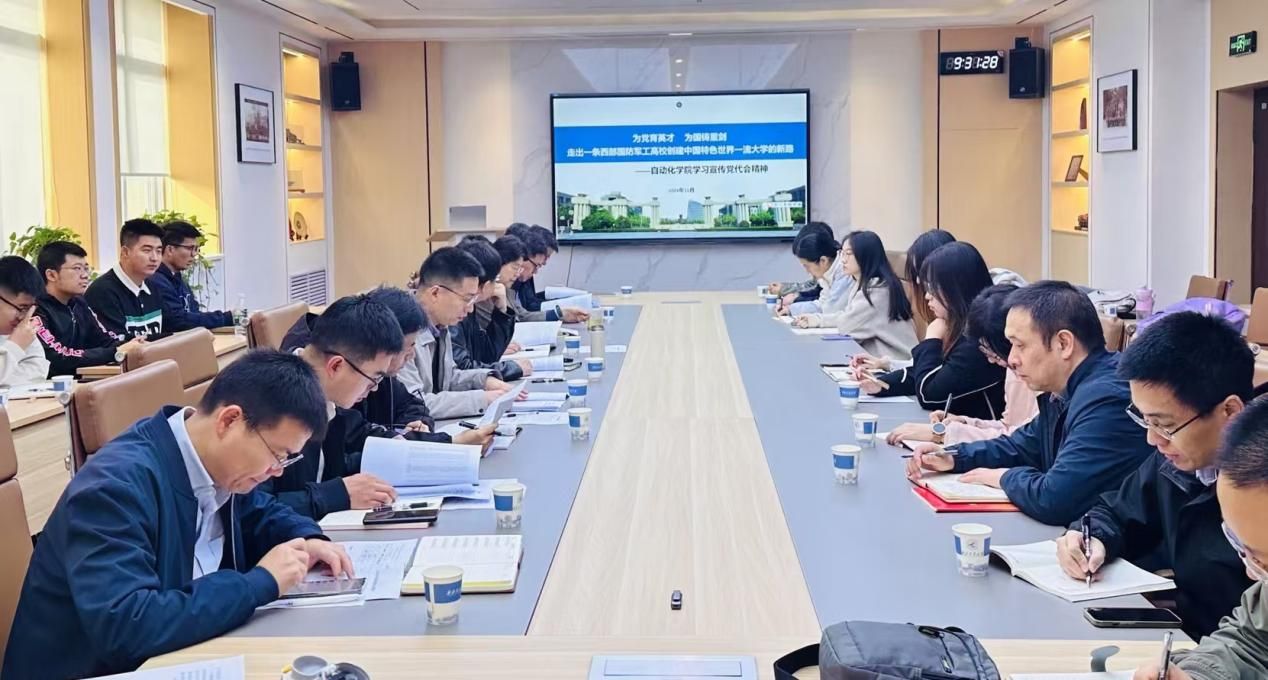 韩军伟在宣讲党的二十届三中全会精神和全国教育大会精神基础上,以介绍学校党代会召开情况为切入点,从“五年来主要成绩、深化对学校高质量发展认识、开创高质量发展新局面、新‘三步走’战略构想、奋力谱写一流建设新篇章、高质量党建引领高质量发展”六个部分全面传达学习了学校第十四次党代会精神。韩军伟结合学院发展实际,围绕目标责任制落实,从“总师型”人才培养、高质量有组织科研和高水平师资队伍建设三个维度,详细介绍了如何将落实党代会精神与推进核心指标深度融合、一体推进。韩军伟表示,学院上下应以“勇立潮头敢争先,奋楫向前创未来”的精气神,紧紧抓住学校高质量发展的关键时期,集中优势资源一体推进学院教育科技人才工作改革,为学校创建中国特色世界一流大学贡献自动化力量。