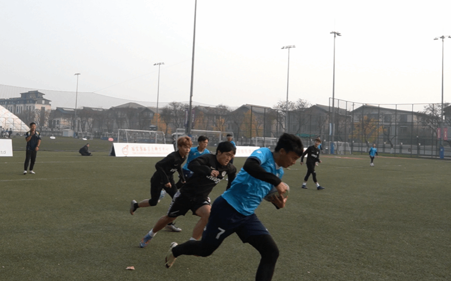 橄榄球代表队对阵中国农业大学的幺幺玖-兽刃联队。队员们稳扎稳打,在防守上寸步不让,步步紧逼,不断向对方进攻队员施压。比赛进行到一半时,李左与梁代福巧妙配合接球突破,顺利拿下一分。这场比赛最终以1:1战平,肉漫屋