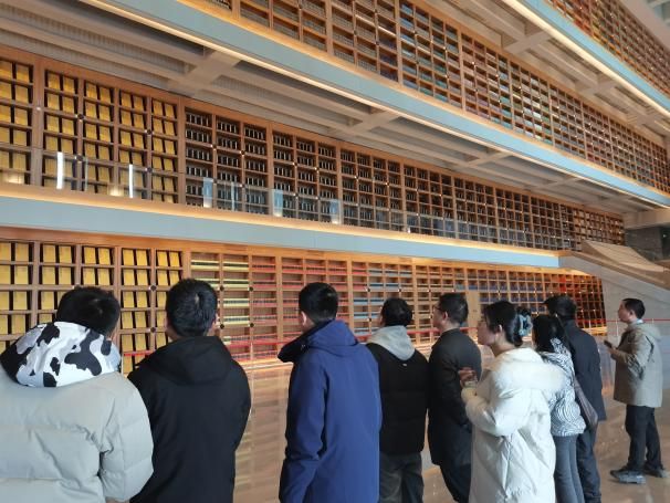 在讲解人员的带领下,全体人员首先来到版本馆园林区域和序厅,了解了版本馆的设立背景、重要意义,以及“山水相融、天人合一、汉唐气象、中国精神”的设计理念和“方正、大气、典雅”的建筑格局。随后,全体人员参观了《楮墨遗珍 万里同风——丝绸之路版本展》和《赓续文脉 踔厉前行——中华文化经典版本展(西部篇)》两个常设特色展厅,感受丝绸之路文明和中华文化版本的深厚底蕴,感悟延安精神和民族复兴版本的红色血脉。