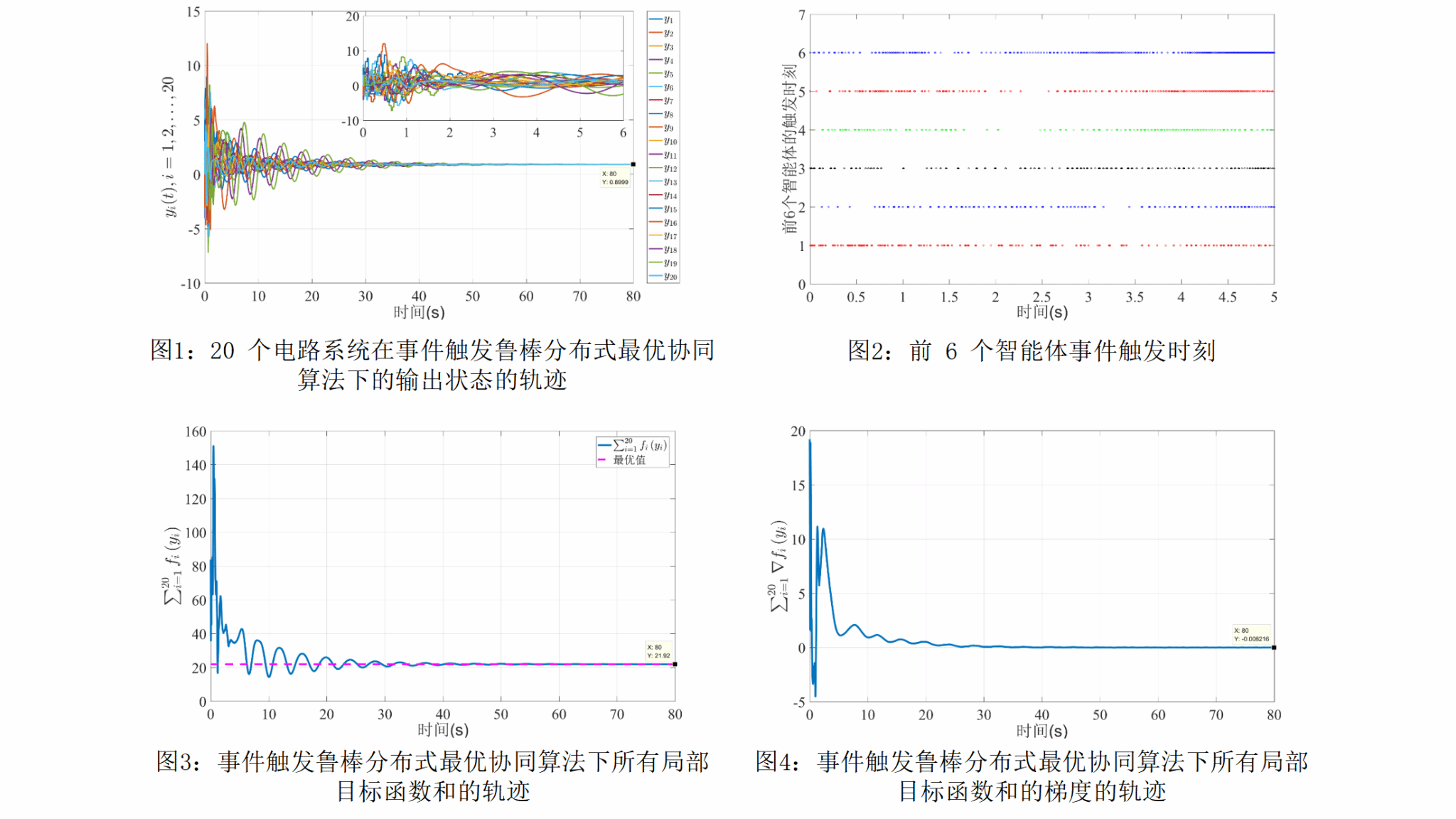 在智能体通讯能量或带宽受限的情况下,引入事件触发的通信机制,为需要智能体间相互通信的平衡补偿器以及最优策略生成器设计相应的事件触发条件来确定下一次通信时刻。接着,设计了一类时间依赖增益来克服触发条件下平衡补偿器的奇异问题。进一步,提出由事件触发平衡补偿器、事件触发最优策略生成器、自适应外部扰动观测器以及输出调节跟踪控制器组成的事件触发鲁棒分布式最优协同算法。提出的事件触发算法不仅能实现系统的最优协同目标,同时能够大大降低通讯频率,提高系统资源利用效率。