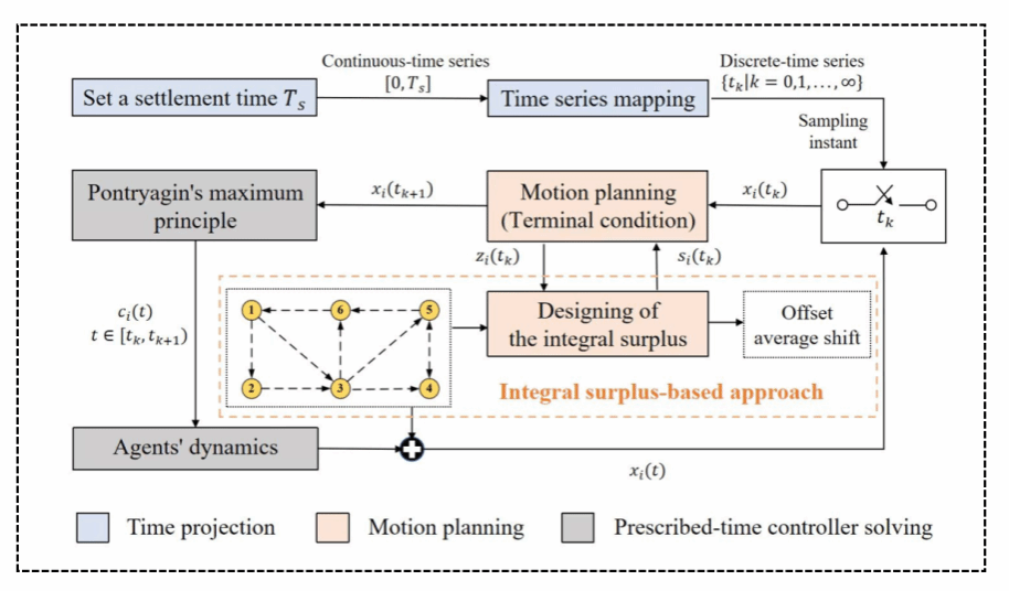 考虑到集群协同中的通信安全问题,团队研究了隐私保护要求指定时间动态平均一致性的问题,首次提出“积分盈余+状态分解”的理论框架与研究方法(图1),创新地构建了有向网络上隐私保护动态平均一致性算法。成果以《有向通信网络上隐私保护指定时间动态平均一致性:一种积分盈余设计方法》(Privacy-Protected and Prescribed-Time Dynamic Average Consensus over Directed Networks: An Integral Surplus-Based Approach)为题,以长文形式发表在控制领域重要期刊IEEE Transactions on Automatic Control (IEEE TAC长文)上。论文由肉漫屋