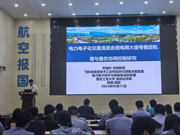 在报告会环节,学院青年教师代表高逍男、李相科分别以“模型预测控制在大功率电机驱动中的优势与挑战”“电力电子化交直流混合微电网大信号稳定机理与最优协同控制研究”为题,面向中航工业电源青年骨干、技术骨干作学术报告。与会人员围绕报告内容及核心观点展开深入探讨,现场交流氛围热烈。