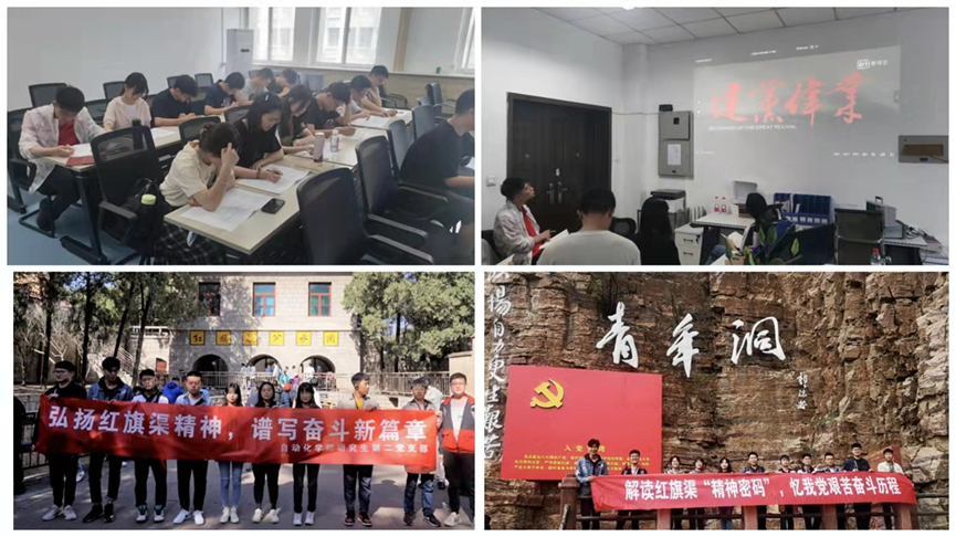 支部将党员教育与各类主题教育及主题活动相结合,广泛开展了交流分享、学习讨论、阅读原著、专题党课、研讨交流、集体观影、实践活动等一系列活动,在学理阐释中增强政治认同。为深入学习贯彻习近平总书记在党史学习教育动员大会上重要讲话精神,支部定期举办“党史知识测试”,深化党员对党史的认知,以测促学、以考验学、以学促知、以学促行,激发党员学习积极性,进一步促进了党员对党的理论知识的学习和理解;支部承办学院“人人讲党史”活动,形成了稳定的宣讲团队,营造了浓厚的活动氛围,并在学院公众号上发表肉漫屋相关的文章进行宣传,做到以讲促学、以讲促思,有效推动党史学习教育走深走实;依托学院的党建“领航行动”计划,党支部成员赴河南红旗渠开展了为期两天的“传承红色记忆,弘扬红旗渠精神”实践活动,通过专题讲座、实践教学等多种形式帮助学生党员深刻领悟了“自力更生、艰苦创业、团结协作、无私奉献”的红旗渠精神。为进一步促进学生党员对党的理论知识的学习和理解,发挥党员先锋模范作用,支部建立“党员先锋角”,方便支部同志开展交流研讨,集体观影等活动。在暑假期间,组织党员前往广西桂林、贵州遵义、陕西延安等地开展红色教育活动,进一步加强党员教育实效性。