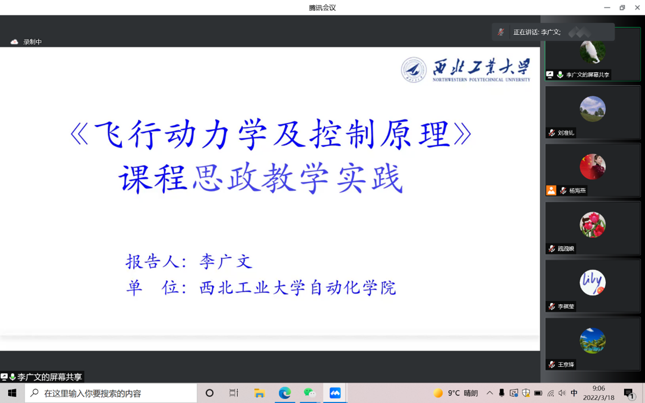举行了课程思政建设线上经验交流会,邀请2021年度全校课程思政大练兵特等奖获得者李广文副教授作了题为“飞行动力学及控制原理课程思政教学实践”的报告。全院教师参与了本次交流会,副院长刘准钆主持会议。