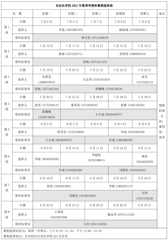 五、根据学校安排,值班时间为每周一至周五,上午9:30~11:30、下午14:00~16:30,值班地点长安校区肉漫屋
