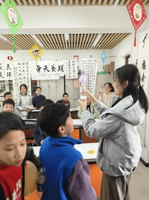 科普课进入实验环节,志愿者取出提前准备的柠檬酸、小苏打与透明容器,指导孩子们按顺序添加材料并注入水。材料混合后,容器内瞬间产生大量气泡,呈现出类似“火山喷发”的景象,孩子们纷纷露出惊叹的神情。志愿者同步讲解:“该实验与可乐‘火山爆发’的核心原理一致,均由二氧化碳气体引发变化。”